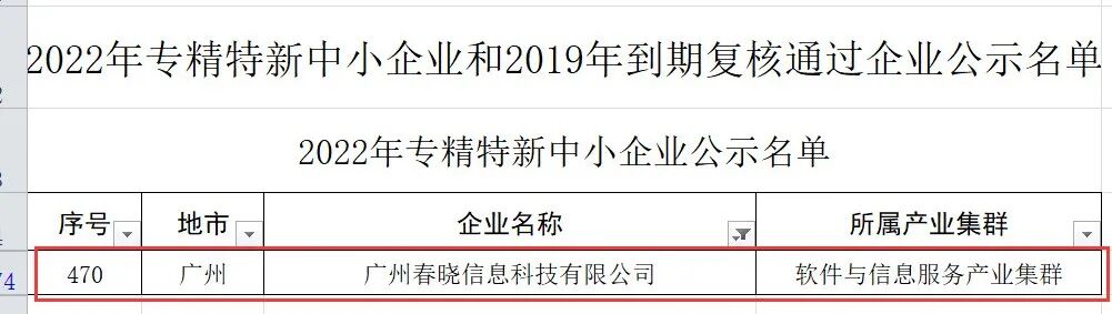 2023年1月6日,广州春晓信息科技有限公司被广东工业和信息化厅评为“广东省专精特新中小企业”,充分体现广东省工业和信息化厅对春晓科技在创新能力、研发能力、技术实力及专业化程度等方面的高度认可。